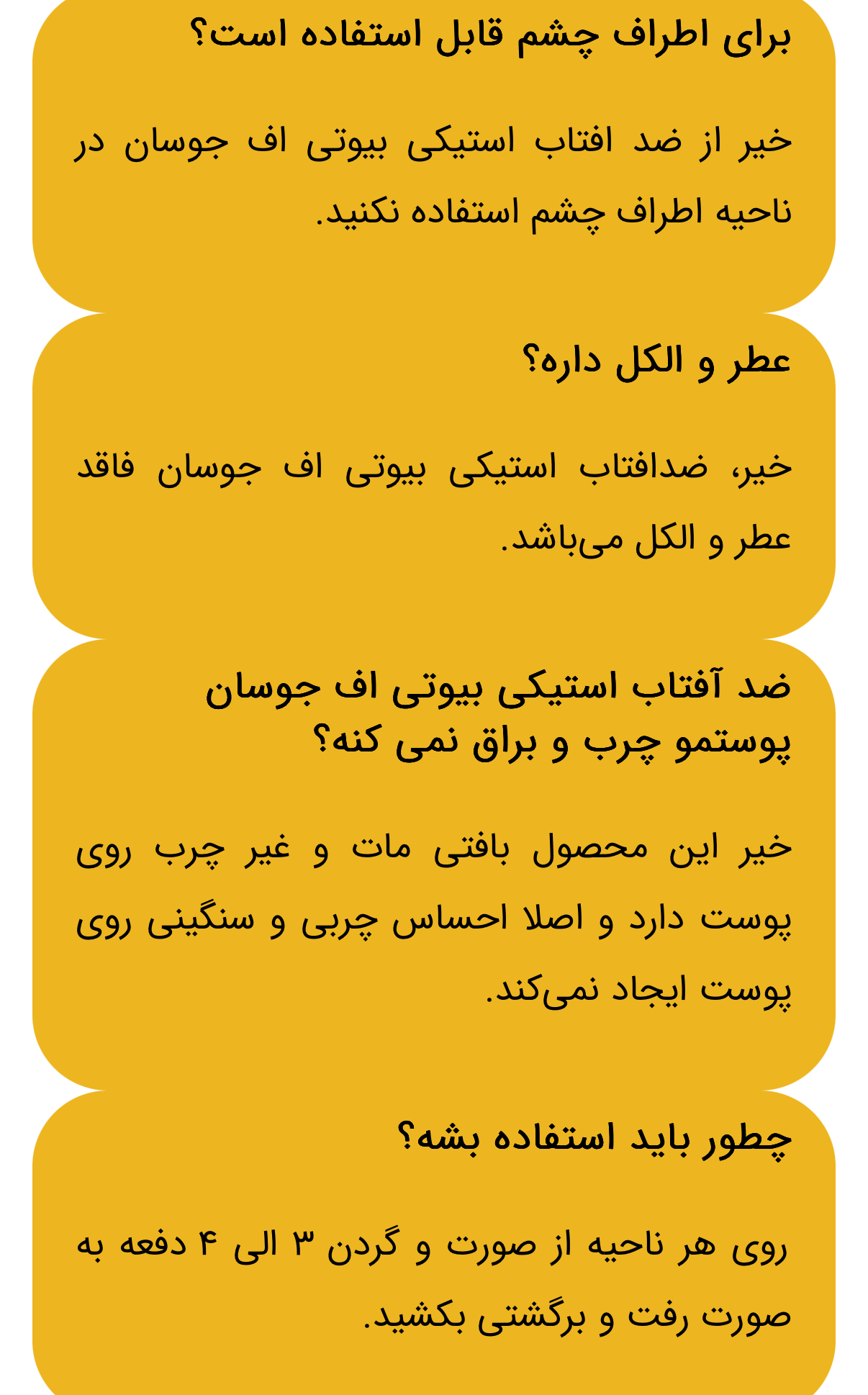 نیم ساعت قبل از قرار گرفتن در معرض خورشید، ضدافتاب استیکی بیوتی اف جوسان را روی پوست صورت و گردن بزنید. هر دو الی سه ساعت یکبار تمدید نمایید.